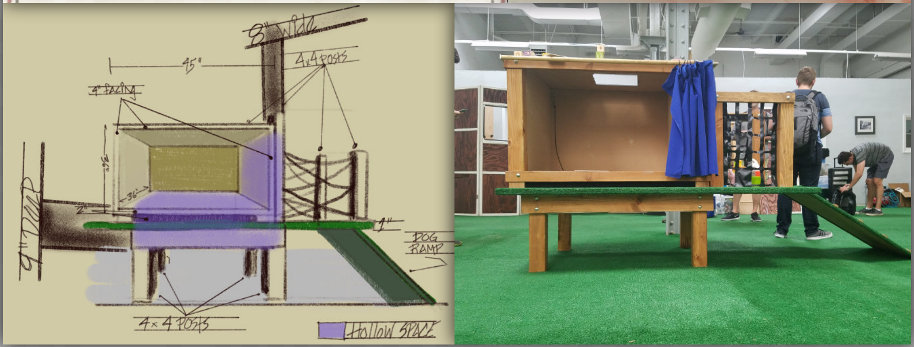 What you are looking at is the original artwork for an illusion design. After a creative meeting for the show The Carbonaro Effect, they needed a creative way to hide a person in a box that would match the decor at an indoor dog park. I created this drawing while visiting the park. It was a quick sketch that was then turned into a CAD drawing and sent to an illusion builder in Las Vegas. He cut the needed pieces based on the drawing and sent it to us to assemble. It was exactly like my original sketch. See the full size image for a side by side comparison of what the actual prop looked like.