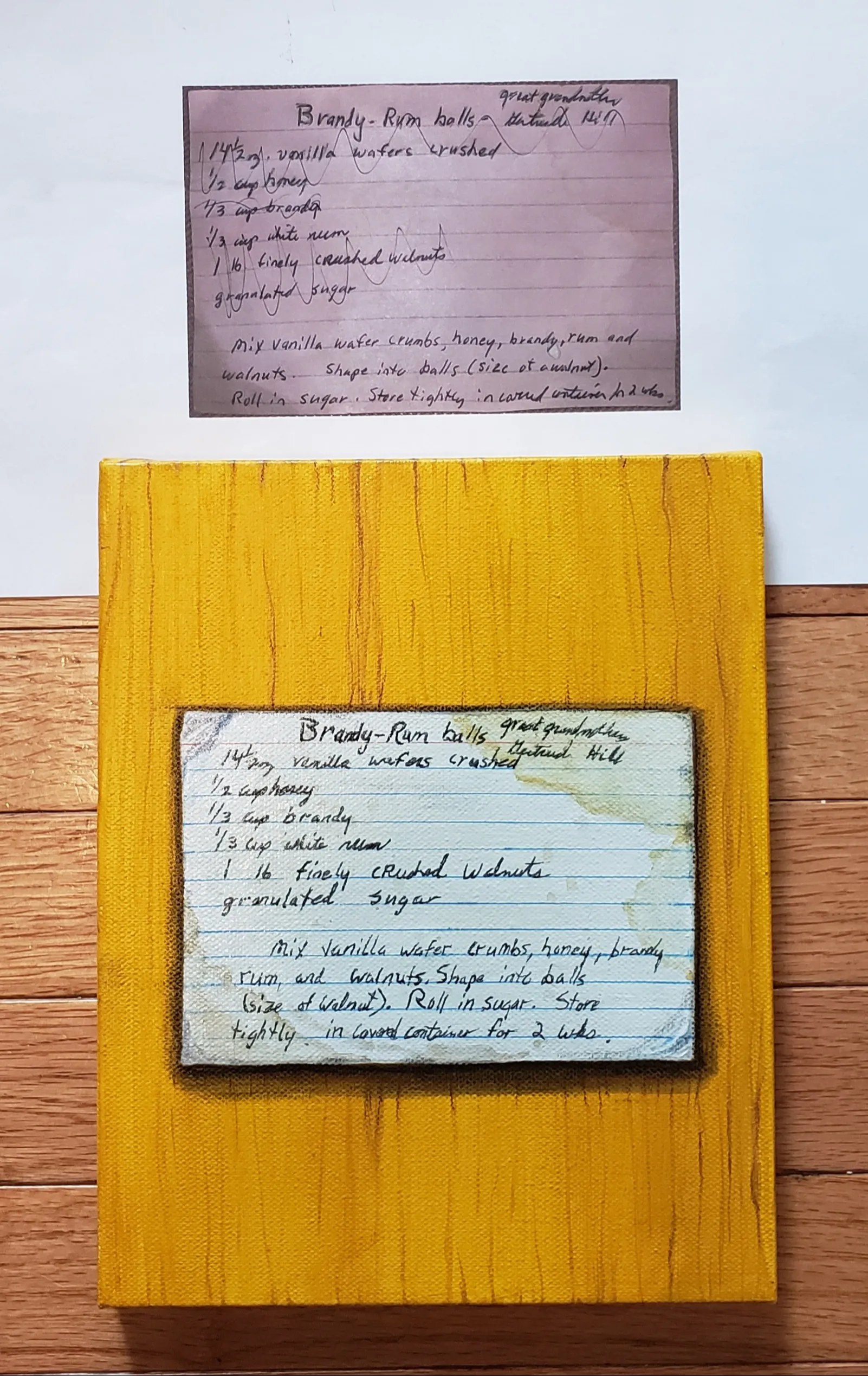 What do you do when your families recipe cards that have been passed down for several generations start to fall apart? You call me! I recreated these amazing recipes in paint and even duplicated the handwriting and stains on the cards. Each of which tells the story of who wrote it and the many mouths it made happy.